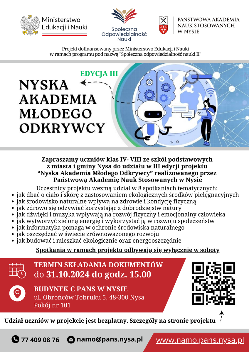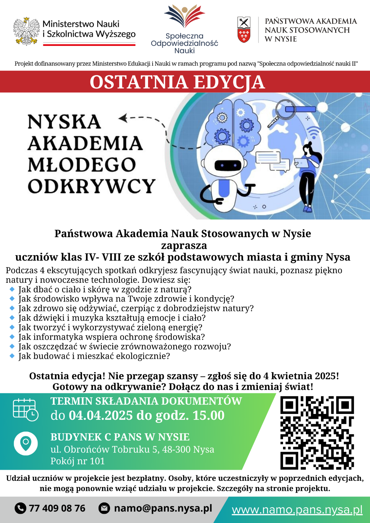 Państwowa Akademia Nauk Stosowanych w Nysie zakończyła realizację projektu Nyska Akademia Młodego Odkrywcy - NAMO skierowanego do uczniów klas 4–8 szkół podstawowych. Ogólnie w 4 edycjach tej niezwykłej inicjatywy wzięło udział 242 dzieci z 11 szkół podstawowych Gminy Nysa, które z ogromnym zaangażowaniem i ciekawością odkrywały świat nauki oraz rozwijały swoje pasje w duchu zrównoważonego rozwoju.