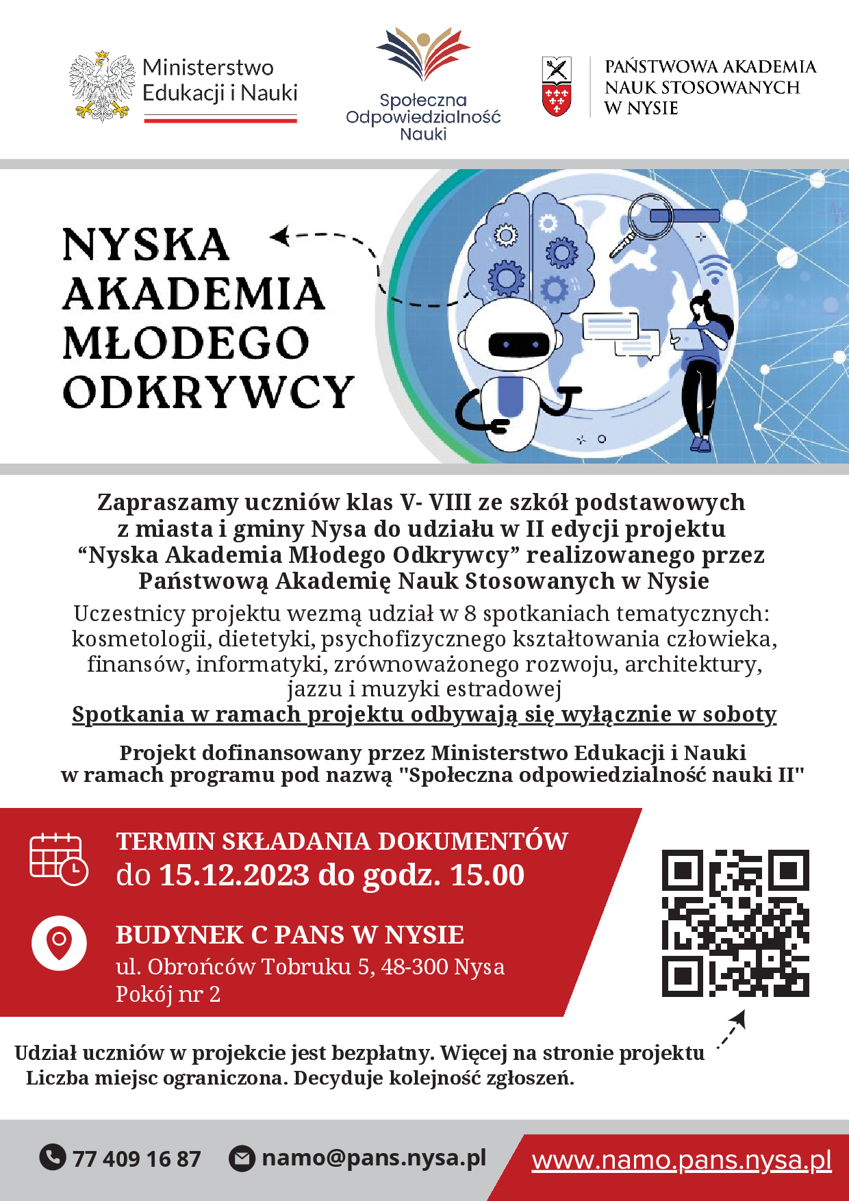 Drodzy Rodzice, zapraszamy zainteresowanych uczniów z klas V do VIII szkół podstawowych znajdujących się na terenie miasta I gminy Nysa do udziału w projekcie "Nyska Akademia Młodego Odkrywcy". Projekt dofinansowany ze środków Ministra Edukacji i Nauki w ramach programu pod nazwą „Społeczna odpowiedzialność nauki II”.
