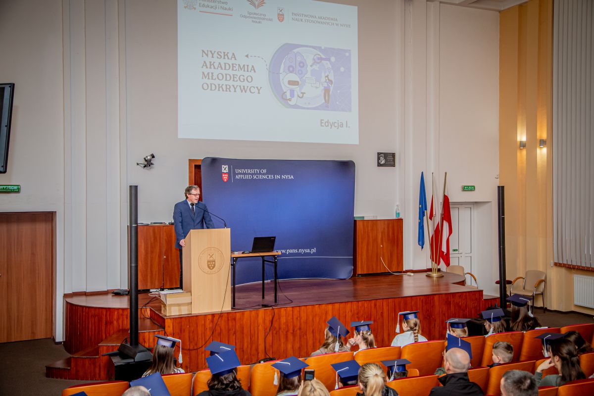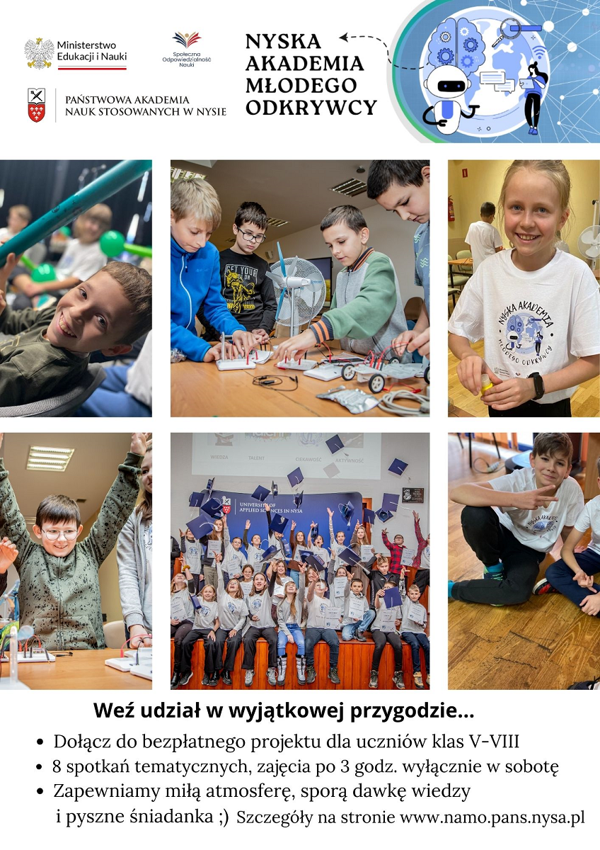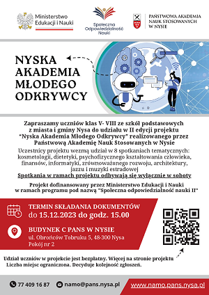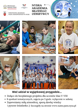 “Nyska Akademia Młodego Odkrywcy” dofinansowana jest ze środków budżetu państwa, przyznanych przez Ministra Edukacji i Nauki w ramach Programu „Społeczna odpowiedzialność nauki II”. Inicjatywa jest skierowana do dzieci i młodzieży klas V do VIII uczęszczających do szkół z terenu miasta i gminy Nysa, a w I edycji realizowanej w okresie od października do grudnia 2023 roku uczestniczyło 32 uczniów z nyskich szkół podstawowych: SP nr 1, SP nr 3, SP nr 5, SP nr 10, NSP w Nysie, ZSP w Goświnowicach.