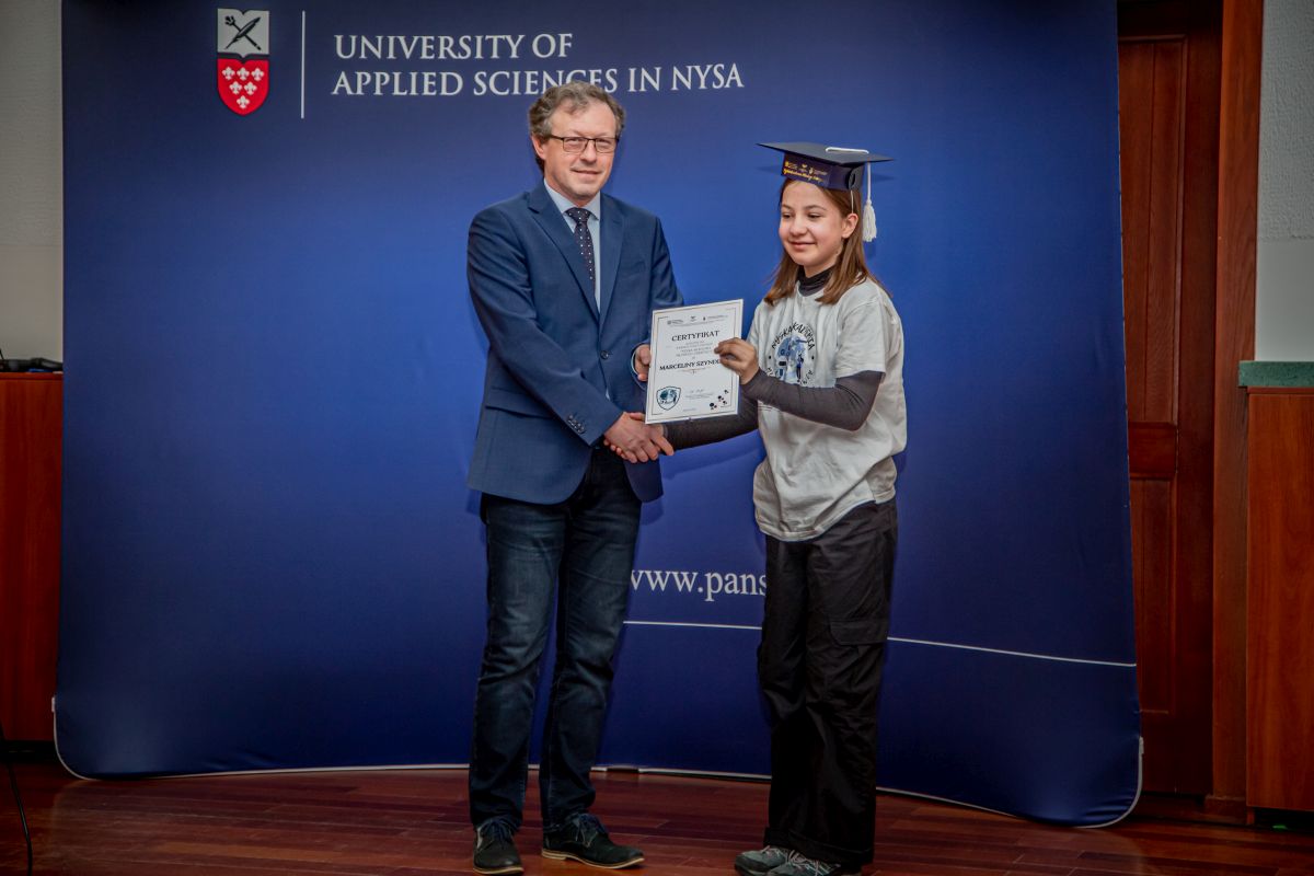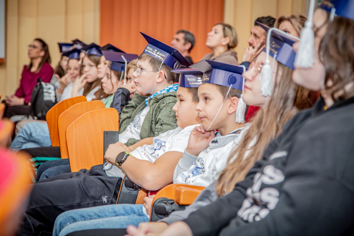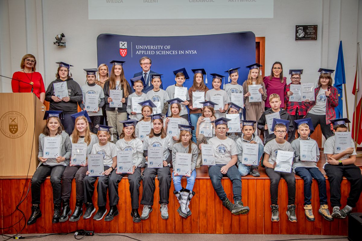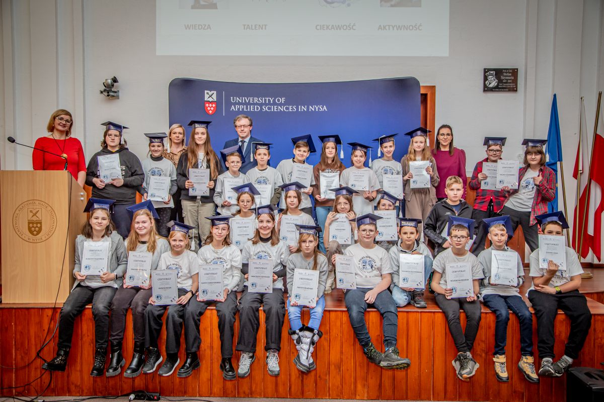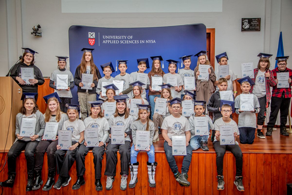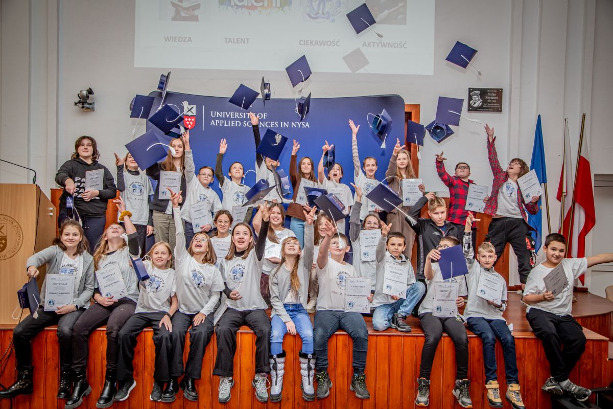 W dniu 16.12.2023 r. w Państwowej Akademii Nauk Stosowanych w Nysie odbyło się uroczyste zakończenie pierwszej edycji projektu “NYSKA AKADEMIA MŁODEGO ODKRYWCY”. Podczas ostatniego już spotkania dokonano podsumowania zrealizowanych zajęć, a wszyscy uczestnicy otrzymali birety i certyfikaty udziału w projekcie.
