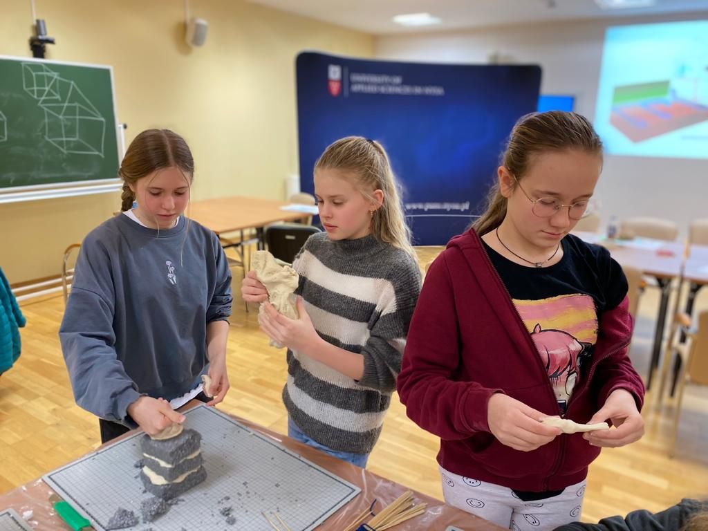 W sobotnich zajęciach z Architektury wzięli udział uczniowie młodszej grupy projektowej z klas V– VI szkół podstawowych. Spotkanie tematyczne „Jak budować i mieszkać ekologicznie i energooszczędnie” zostało przeprowadzone przez Panią mgr inż. arch. Ewę Matras. Celem warsztatów było umożliwienie uczestnikom projektu poznanie podstawowych zagadnień związanych z problematyką ekologii i energooszczędności w architekturze. Uczestnicy zostali podzieleni na grupy tematyczne i mieli za zadanie opracowanie przydzielonych im tematów w zakresie ekologii, tj. wykorzystanie materiałów naturalnych; pozyskiwanie wody deszczowej do celów gospodarczych, biotyczne przegrody w budownictwie oraz w zakresie energooszczędności. Dodatkowo młodzież tworzyła modele przestrzenne budynków z masy solnej, na których prezentowali wymyślone przez siebie rozwiązania dotyczące mieszkalnictwa ekologicznego i energooszczędnego. Na zakończenie zajęć uczestnicy poznali zasady modelowania 3D w AutoCAD i stworzyli komputerowo własne trójwymiarowe bryły i budynki mieszkalne.