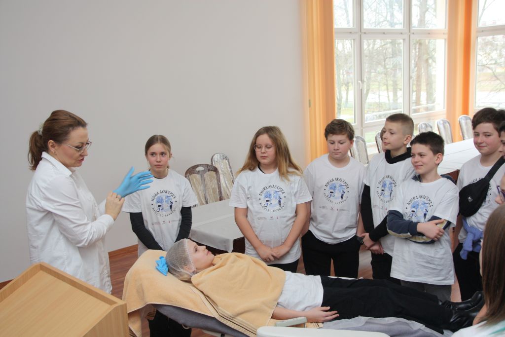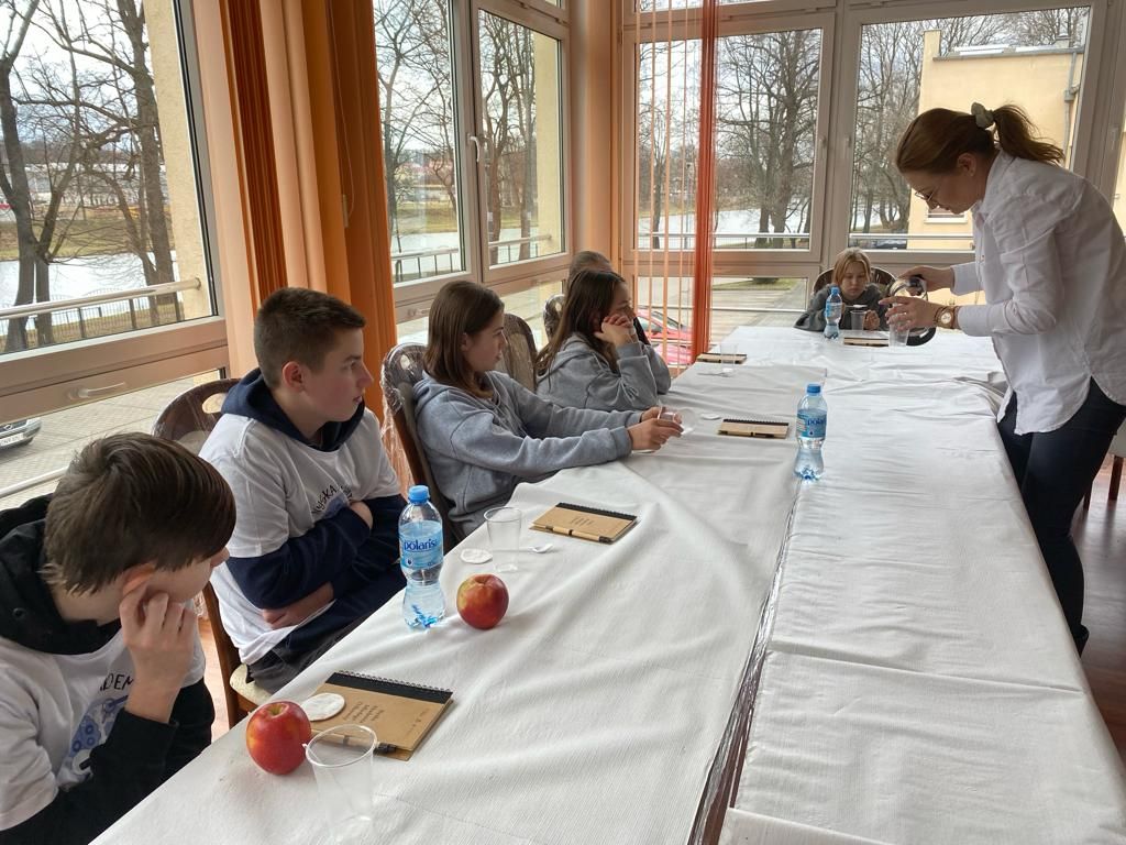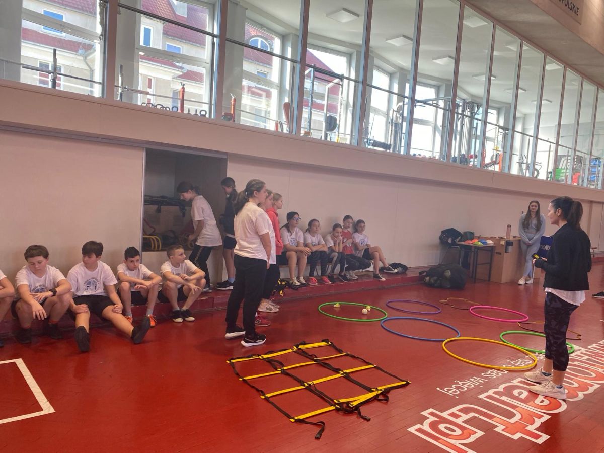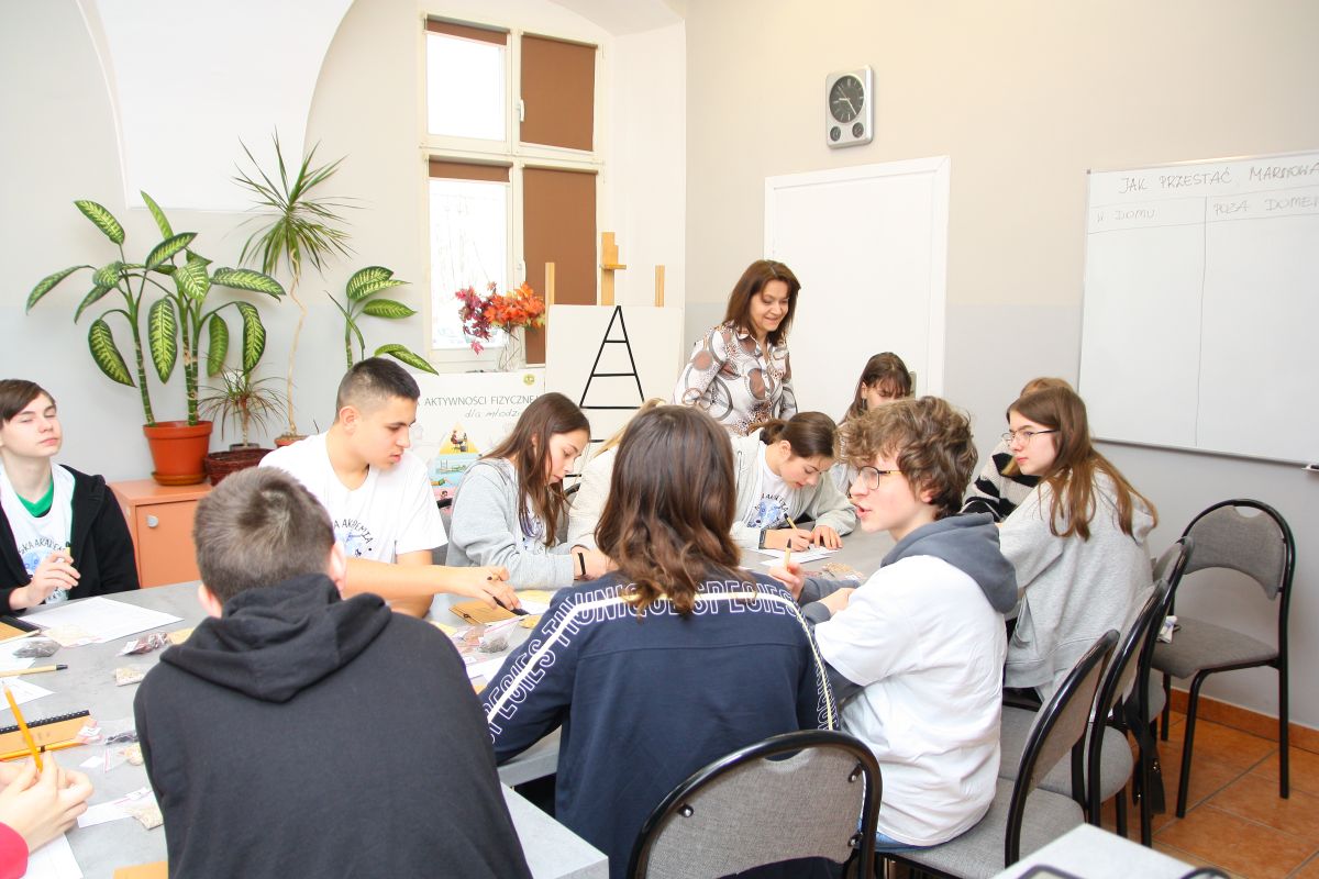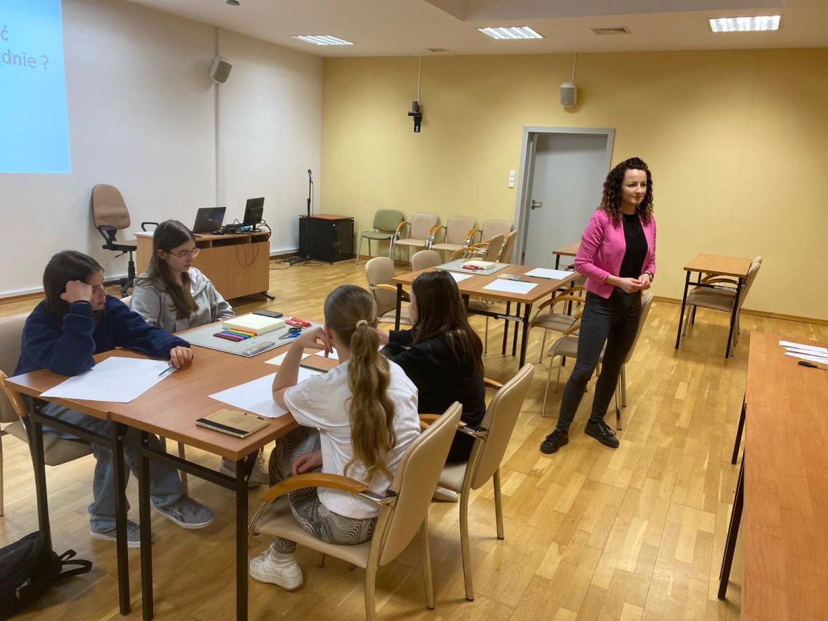 Również w sobotę 17.02.2024 odbyły się zajęcia młodszej grupy uczestników projektu z klas V-VI poświęcone zdrowemu stylowi życia pod nazwą: „Zdrowie i kondycja fizyczna w zdrowym środowisku naturalnym”. Na warsztatach zostały omówione składowe stylu życia ze szczególnym uwzględnieniem aktywności fizycznej oraz technik relaksacyjnych. Wspomniano również o najczęściej popełnianych błędach w zachowaniu, które powodują wady postawy ciała. Młodzież miała dużą wiedzę na poruszane tematy podczas warsztatów, stąd też prowadząca dr n. o zdr. Ewa Szura skupiła się bardziej na motywacji do działania by faktycznie umieć korzystać z posiadanej już wiedzy. Porozmawiano o tym co stanowi problem w dbaniu o zdrowie. Poruszono temat słodyczy, lenistwa w podejmowaniu aktywności fizycznej, postawy ciała, higieny snu i wiele innych zagadnień, w tym również trening uważności. Warsztaty zostały urozmaicone grami i zabawami ruchowymi mające na celu większą integrację grupy projektowej.