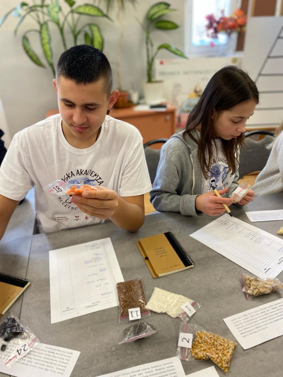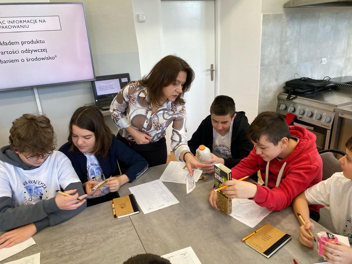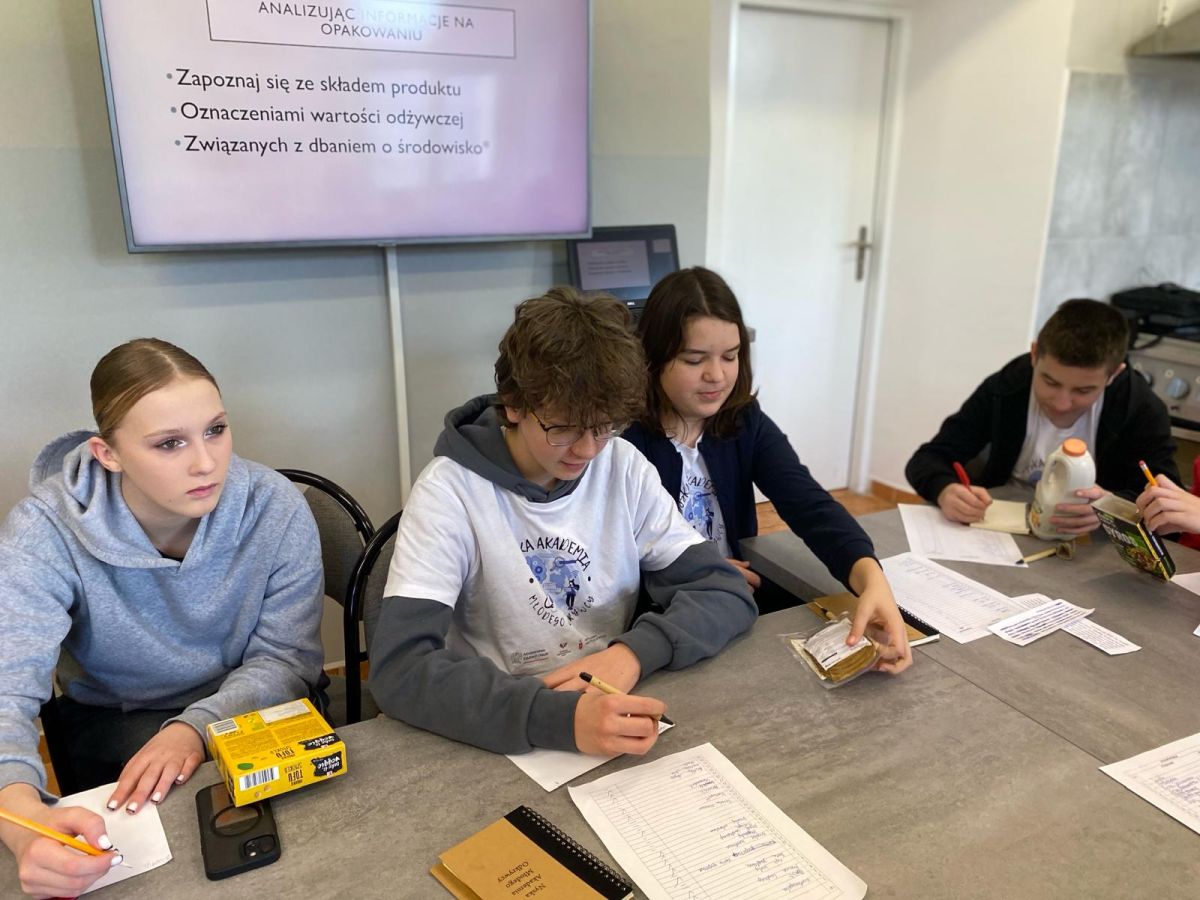 Dnia 09.03.2024 odbyły się zajęcia z Dietetyki dla młodszej grupy uczestników z klas V–VI, które zostały poprowadzone przez Panią dr n. med. Martę Misiarz. Warsztaty o tematyce żywieniowej ukierunkowane były na poznaniu wiedzy jak prawidłowo czytać etykiety z wartościami odżywczymi produktów spożywczych oraz na poznaniu właściwego planowania posiłków w duchu zero waste. Uczestnicy projektu dowiedzieli się, że dzięki zmniejszaniu ilości mięsa i produktów odzwierzęcych w swojej diecie na rzecz produktów pochodzenia roślinnego stosują zasady diety przyjaznej planecie. Młodzież miała okazję zaznajomić się z koncepcjami diety planetarnej, która wpływa korzystnie na zdrowie, ale również tym samym oddziałuje na ochronę środowiska naturalnego. Dieta planetarna jest podejściem żywieniowym, które ma na celu zmniejszenie naszego wpływu na planetę poprzez zmianę sposobu, w jakim spożywamy żywność. Jest to jednocześnie dieta zdrowa, zrównoważona i przyjazna dla środowiska.