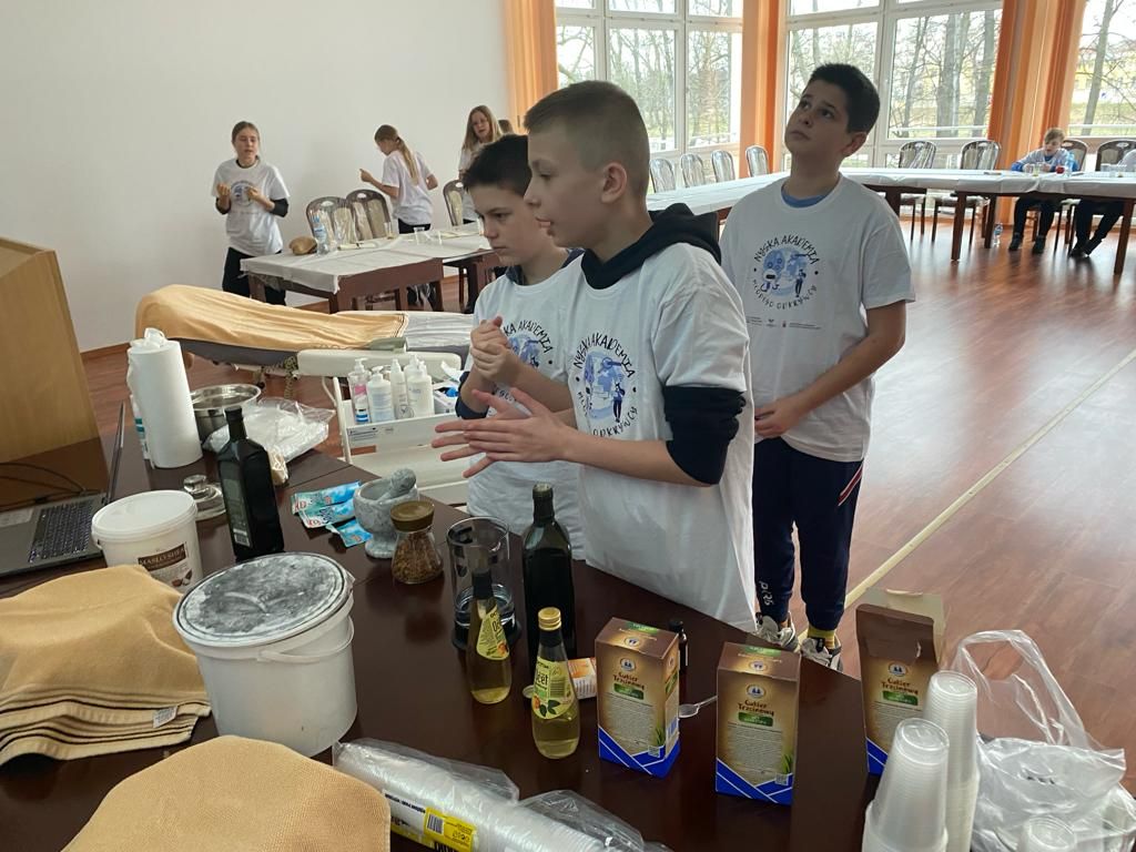 Dnia 3.02.2024 odbyły się pierwsze zajęcia w obu grupach wiekowych w ramach II edycji dla uczestników projektu „Nyska Akademia Młodych Odkrywców”, które miały na celu dostarczyć uczestnikom projektu cenną wiedzę na temat ekologicznych środków pielęgnacyjnych. Zajęcia przeprowadzone przez Panią mgr Agnieszkę Stasieńko-Tłuczek koncentrowały się na pielęgnacji ciała i skóry, promując przy tym ekologiczne metody i produkty pielęgnacyjne, jakie możemy stworzyć sami w domu, omówieniu korzyści dla zdrowia jak i środowiska, jak działają i dlaczego są korzystne dla naszego ciała i skóry. Uczestnicy projektu uczyli się korzystać z naturalnych składników (takich jak oleje, ekstrakty roślinne, miód, itp.) i technik, aby właściwie dbać o swoje ciało, jednocześnie dbając o środowisko. Wśród poruszanych zagadnień pojawiły się także testy skórne i diagnostyka oraz certyfikacja i oznaczenie ekologicznych kosmetyków. Podczas zajęć uczestnicy próbowali samodzielnie przygotować własną ekologiczną pastę do zębów, peeling cukrowy czy tonik oczyszczający.