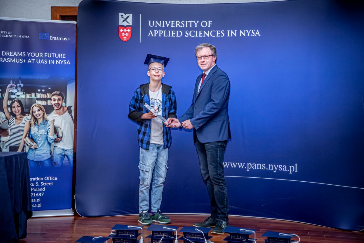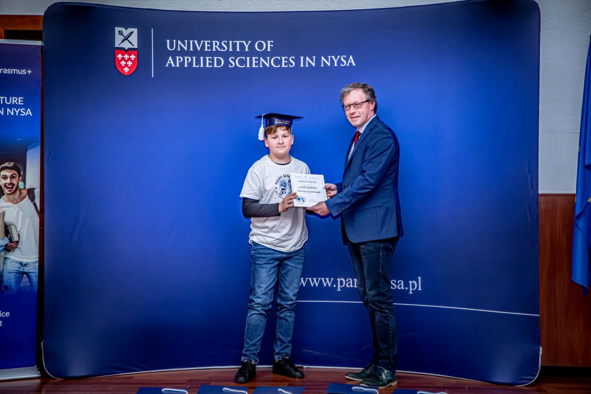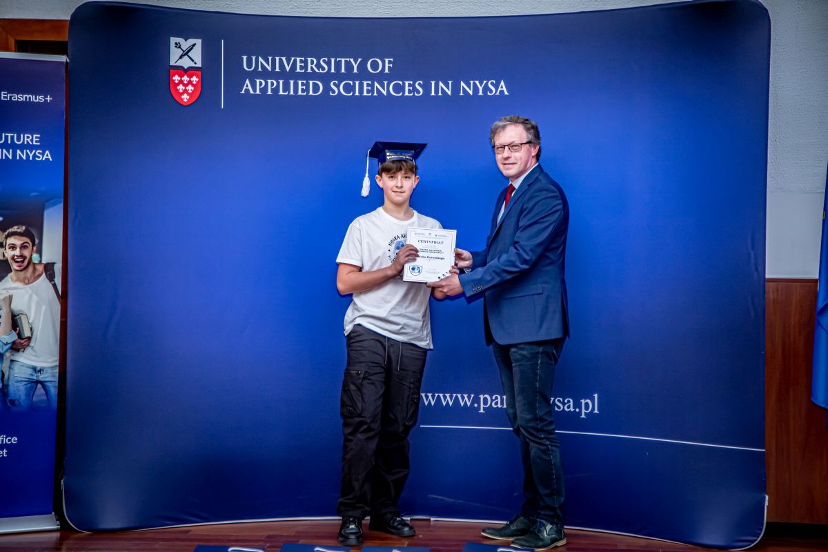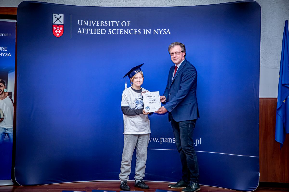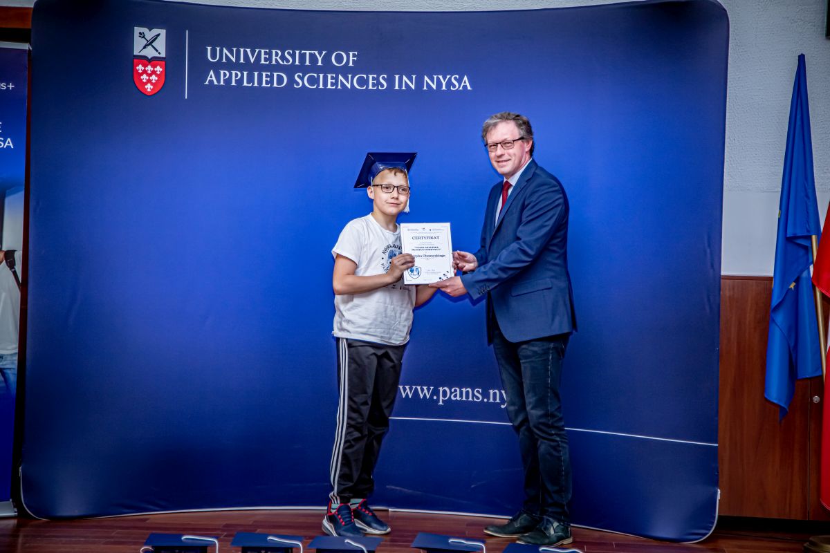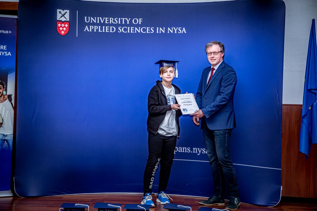 W dniu 20.04.2024 r. w Państwowej Akademii Nauk Stosowanych w Nysie odbyło się uroczyste zakończenie drugiej edycji projektu “NYSKA AKADEMIA MŁODEGO ODKRYWCY”. Podczas ostatniego już spotkania projektowego podsumowaliśmy trzy miesiące zrealizowanych zajęć, które były pełne naukowych odkryć i praktycznych doświadczeń. Wszyscy uczestnicy otrzymali birety i certyfikaty udziału w projekcie.