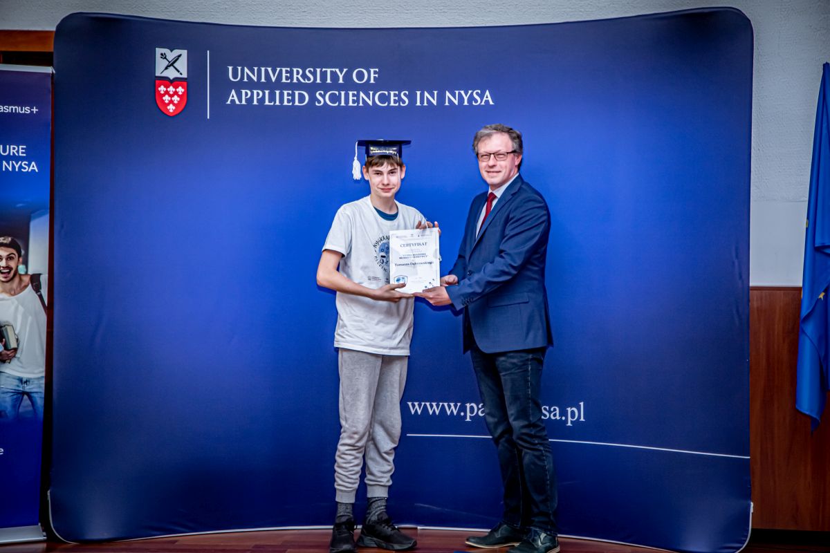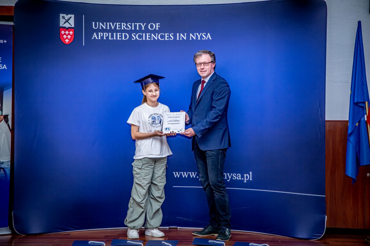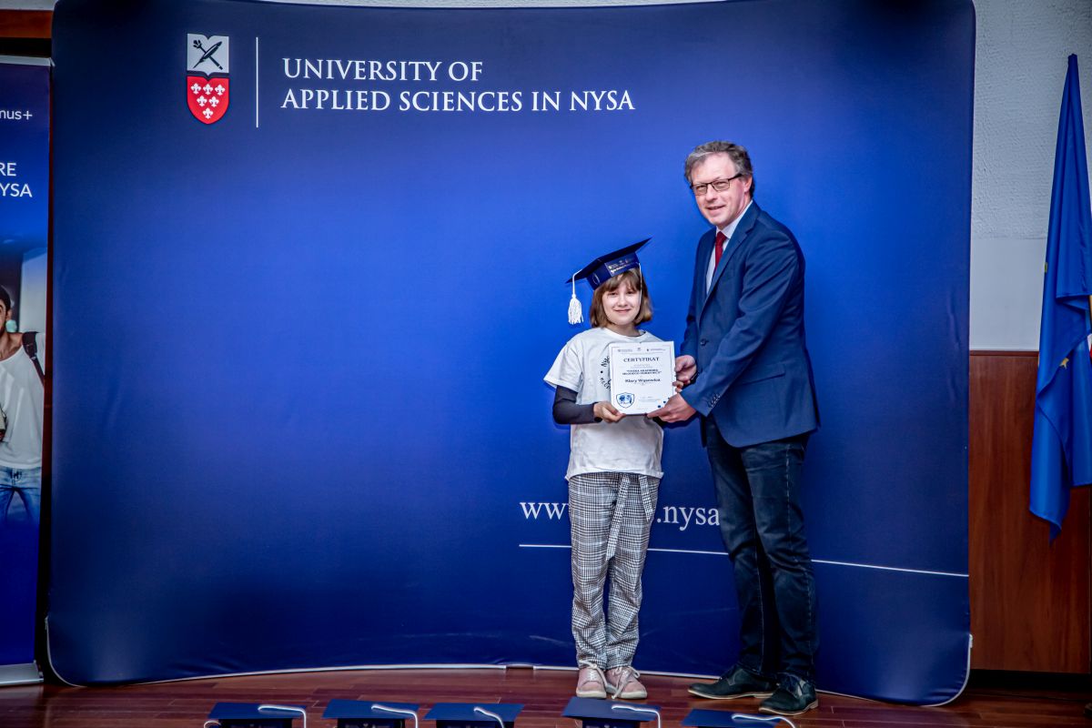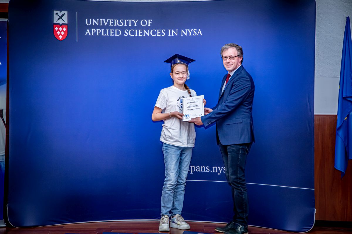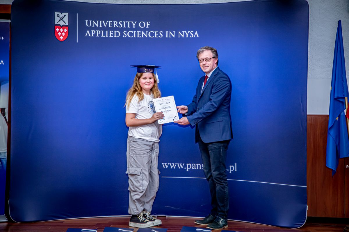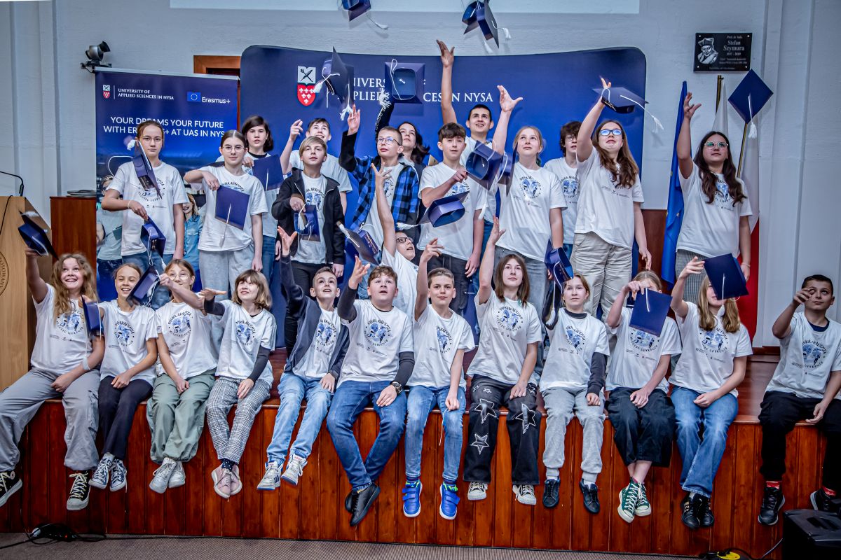 W dniu 20.04.2024 r. w Państwowej Akademii Nauk Stosowanych w Nysie odbyło się uroczyste zakończenie drugiej edycji projektu “NYSKA AKADEMIA MŁODEGO ODKRYWCY”. Podczas ostatniego już spotkania projektowego podsumowaliśmy trzy miesiące zrealizowanych zajęć, które były pełne naukowych odkryć i praktycznych doświadczeń. Wszyscy uczestnicy otrzymali birety i certyfikaty udziału w projekcie.
