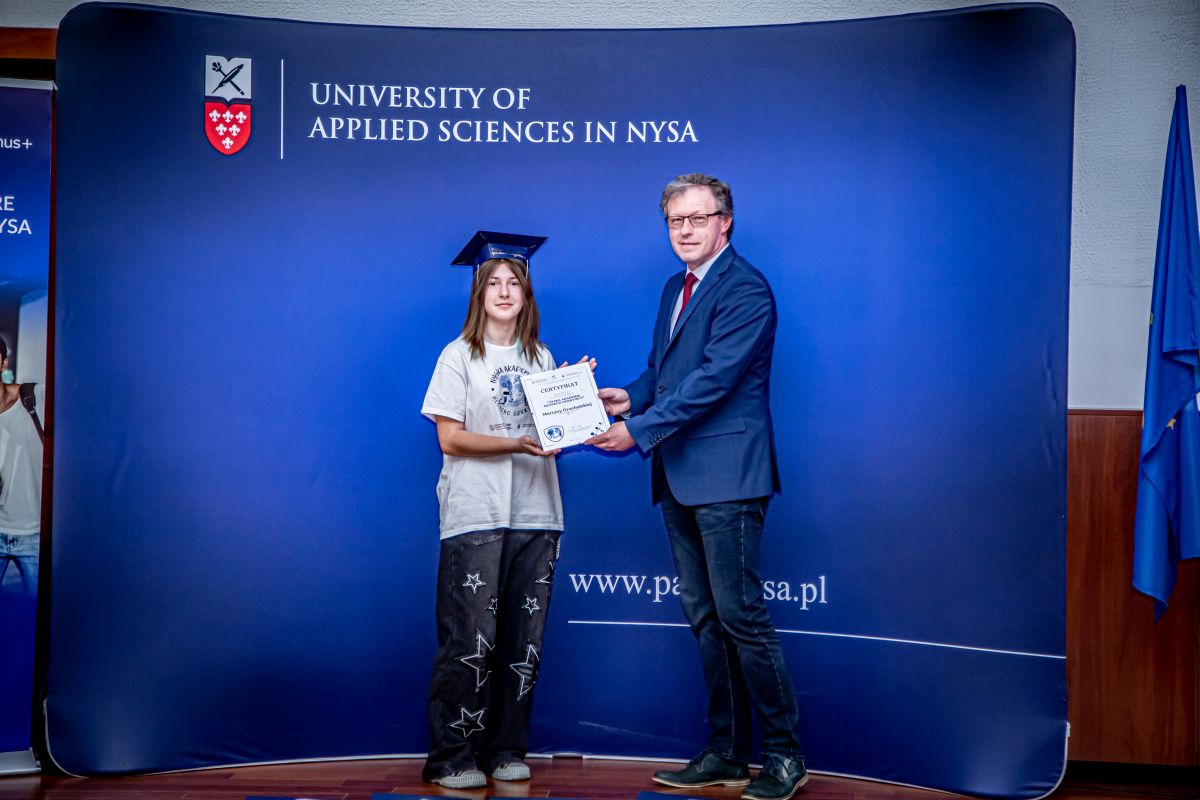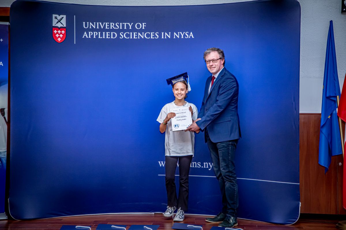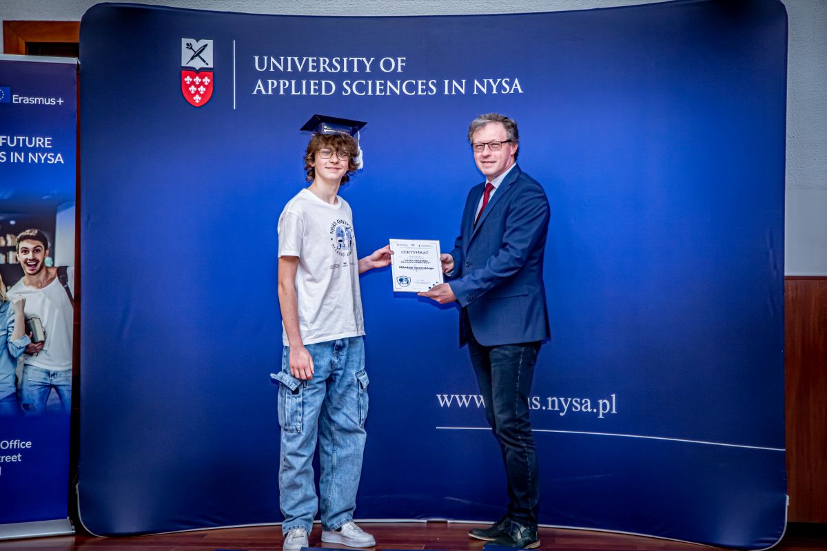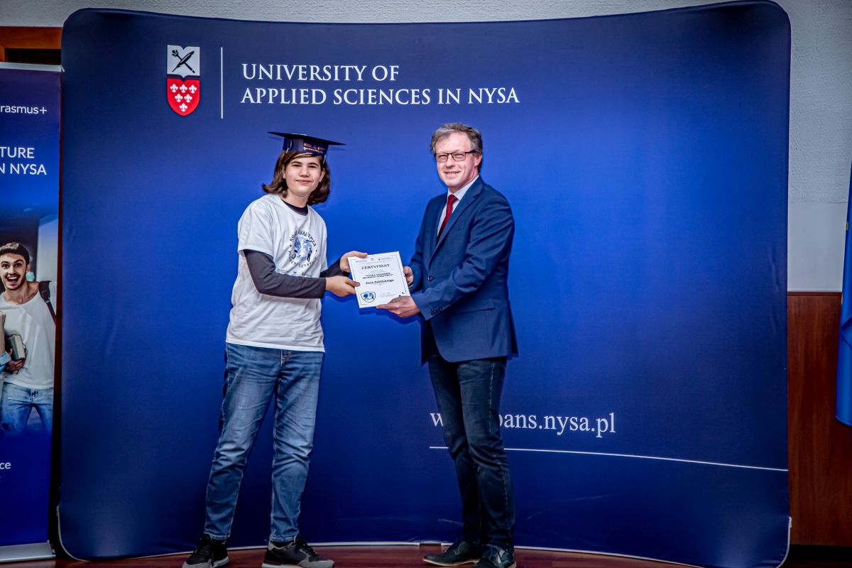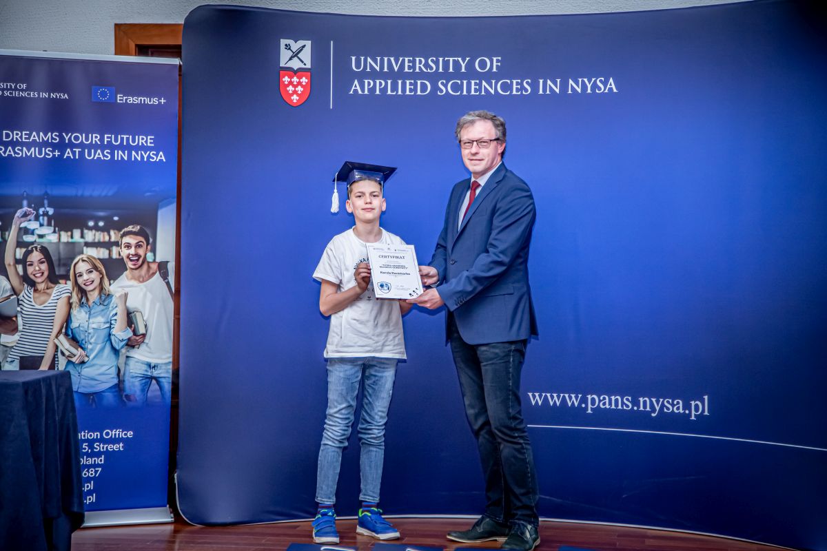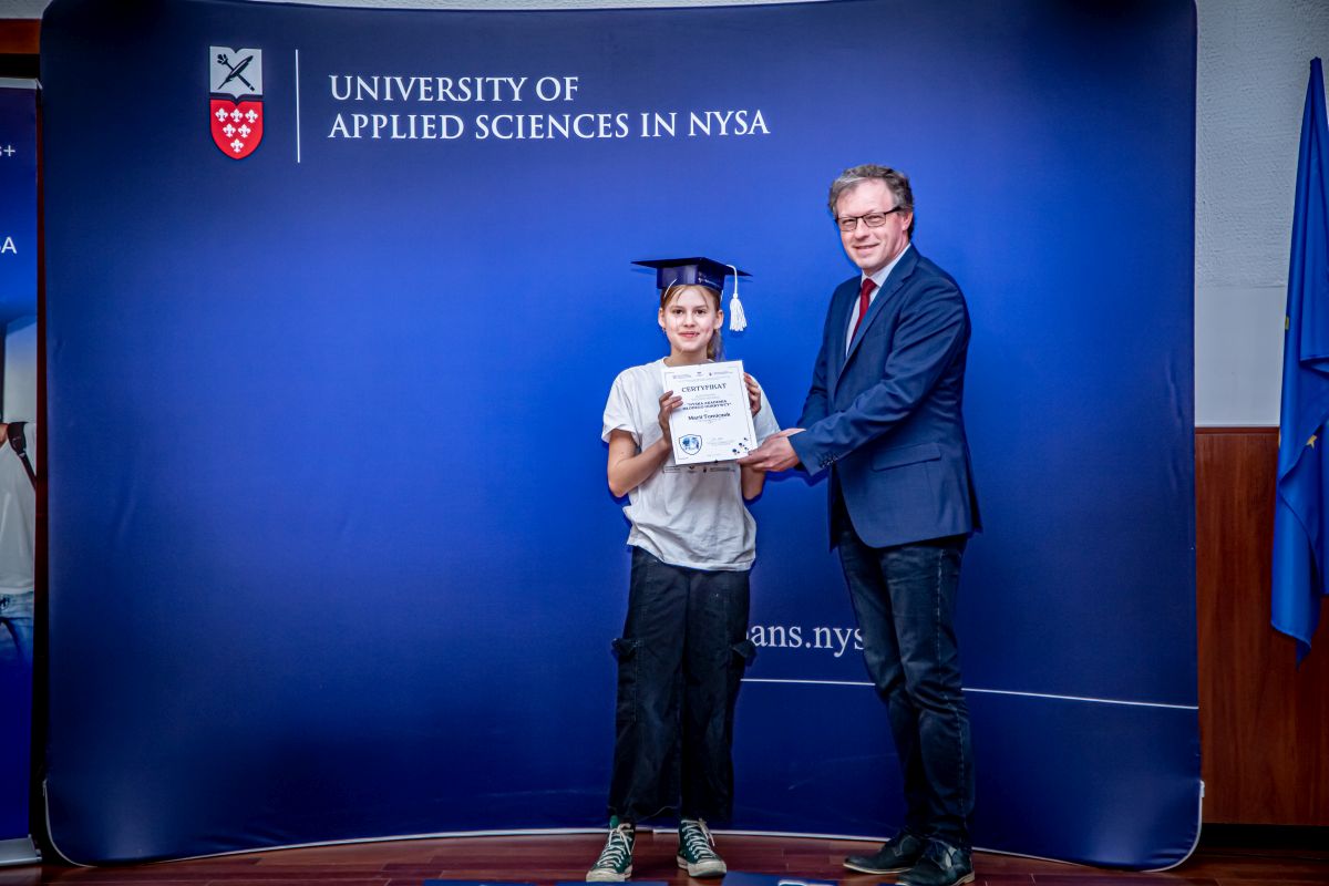 W dniu 20.04.2024 r. w Państwowej Akademii Nauk Stosowanych w Nysie odbyło się uroczyste zakończenie drugiej edycji projektu “NYSKA AKADEMIA MŁODEGO ODKRYWCY”. Podczas ostatniego już spotkania projektowego podsumowaliśmy trzy miesiące zrealizowanych zajęć, które były pełne naukowych odkryć i praktycznych doświadczeń. Wszyscy uczestnicy otrzymali birety i certyfikaty udziału w projekcie.