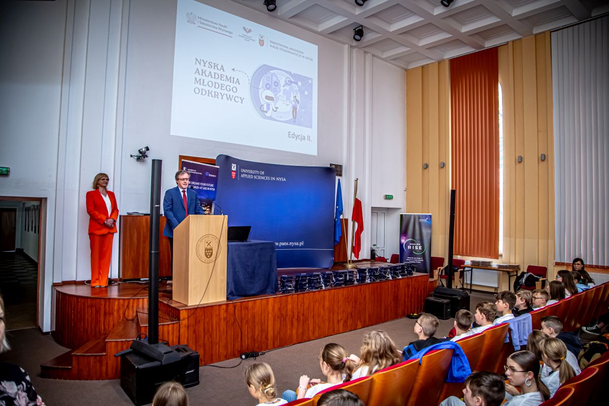 “Nyska Akademia Młodego Odkrywcy” dofinansowana jest ze środków budżetu państwa, przyznanych przez Ministra Edukacji i Nauki w ramach Programu „Społeczna odpowiedzialność nauki II”. Inicjatywa jest skierowana do dzieci i młodzieży klas V do VIII uczęszczających do szkół z terenu miasta i gminy Nysa, a w II edycji realizowanej w okresie od lutego do kwietnia 2024 roku uczestniczyło 44 uczniów z nyskich szkół podstawowych: SP nr 1, SP nr 3, SP nr 5, SP nr 10, Diecezjalnej Szkoły Podstawowej w Nysie oraz ZSP w Białej Nyskiej.