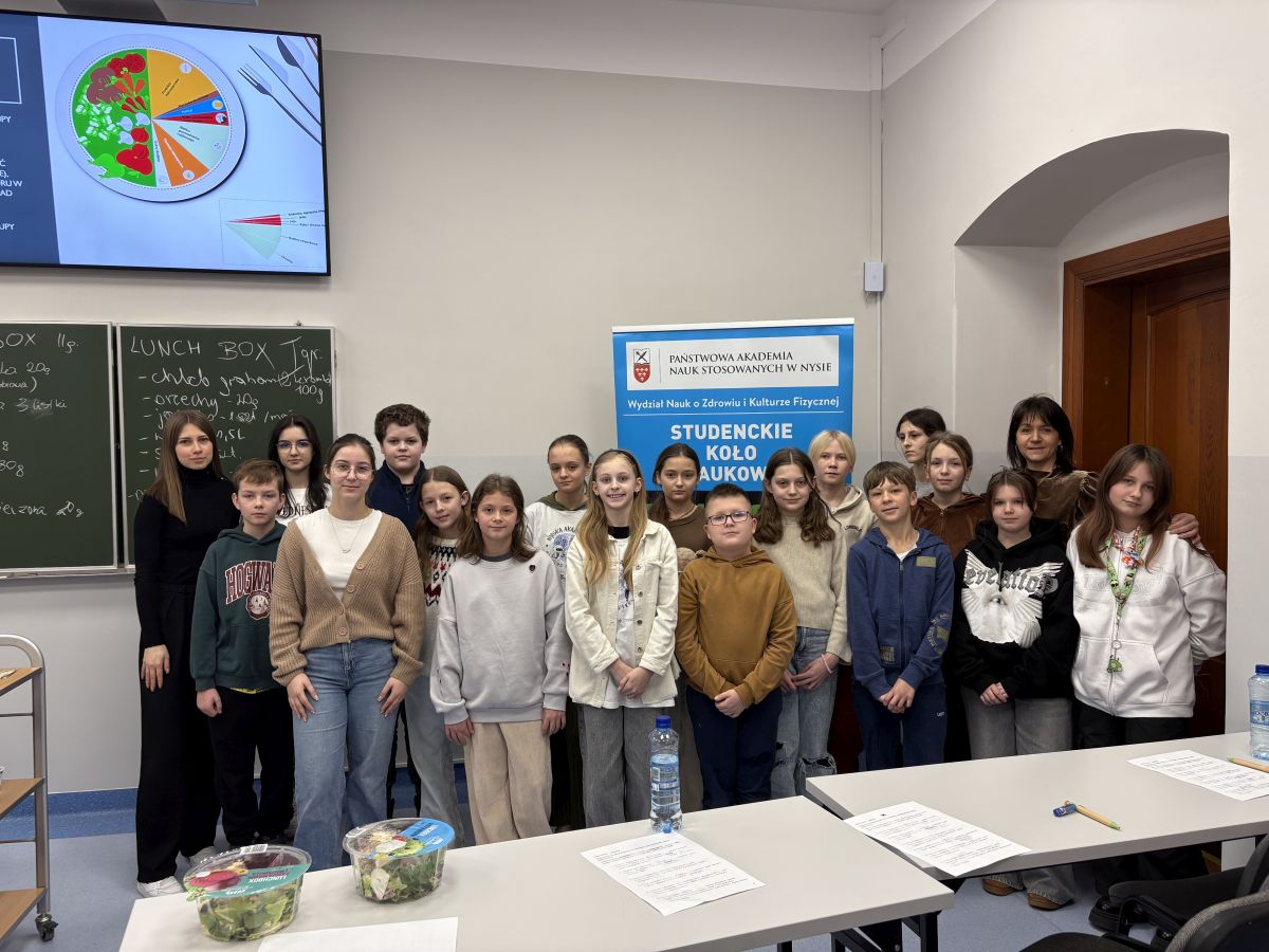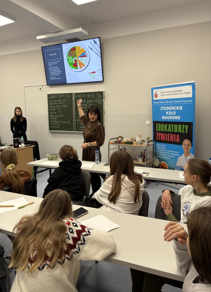 W ubiegłą sobotę, 11 stycznia 2025 roku, odbyły się kolejne zajęcia w ramach III edycji projektu „Nyska Akademia Młodych Odkrywców”, tym razem poświęcone tematyce dietetyki. Warsztaty zostały poprowadzone przez dr n. med. Martę Misiarz oraz przy wsparciu studentek Dietetyki: Dominiki Mulicy, Julii Karmazyn i Klaudii Grociak. Prowadzącą w przystępny sposób przybliżyła uczestnikom zasady diety przyjaznej planecie.