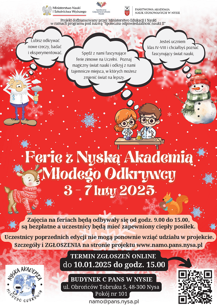 Serdecznie zapraszamy uczniów klas IV-VIII do udziału w wyjątkowej IV edycji NAMO „Ferie z Nyską Akademią Młodych Odkrywców”