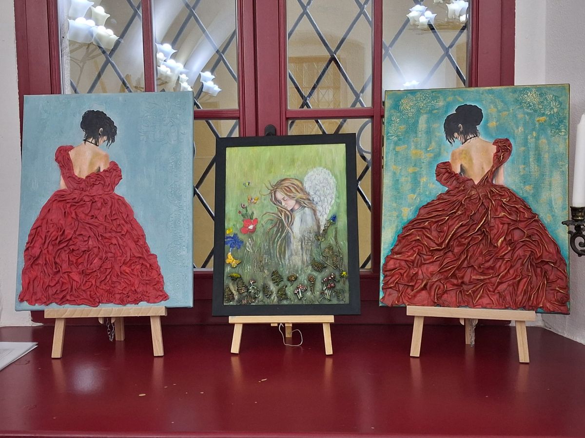 Następnie Ewa Morel zapoznała zgromadzonych gości z działalnością Klubu Rękodzieła „Nie tylko z igłą” , stosownych współczesnych technikach rękodzielniczych (mixmedia, powertex, transfer, masy utwardzalne, pasty strukturalne) oraz pracach dotyczących technik stosowanych przez nasze mamy i babcie, aby ocalić je od zapomnienia (kwiaty z bibuły, decoupage, scrapbooking, wiklina papierowa, ozdoby świąteczne, itp.). Zaprosiła twórczynie - koleżanki rękodzielniczki i malarki, które z ogromnym zaangażowaniem tworzyły swoje prace, wykazując się niezwykłą kreatywnością, pasją i radością tworzenia do przedstawienia się. Były kwiaty i podziękowania. Na warsztatach prowadzonych z ogromnym profesjonalizmem przez P. Ewę Wróblewską (obrazy 2d – wykonane techniką mixmediową z zastosowaniem transferu, użyciem powertexu, mas strukturalnych i farb akrylowych ) i P. Jadwigę Chałas (Kartki okolicznościowe wykonane techniką scrapbookingu) powstały prezentowane na wystawie prace wykonane przez uczestniczki warsztatów – członkinie Klubu Rękodzieła.