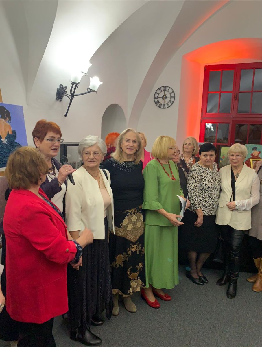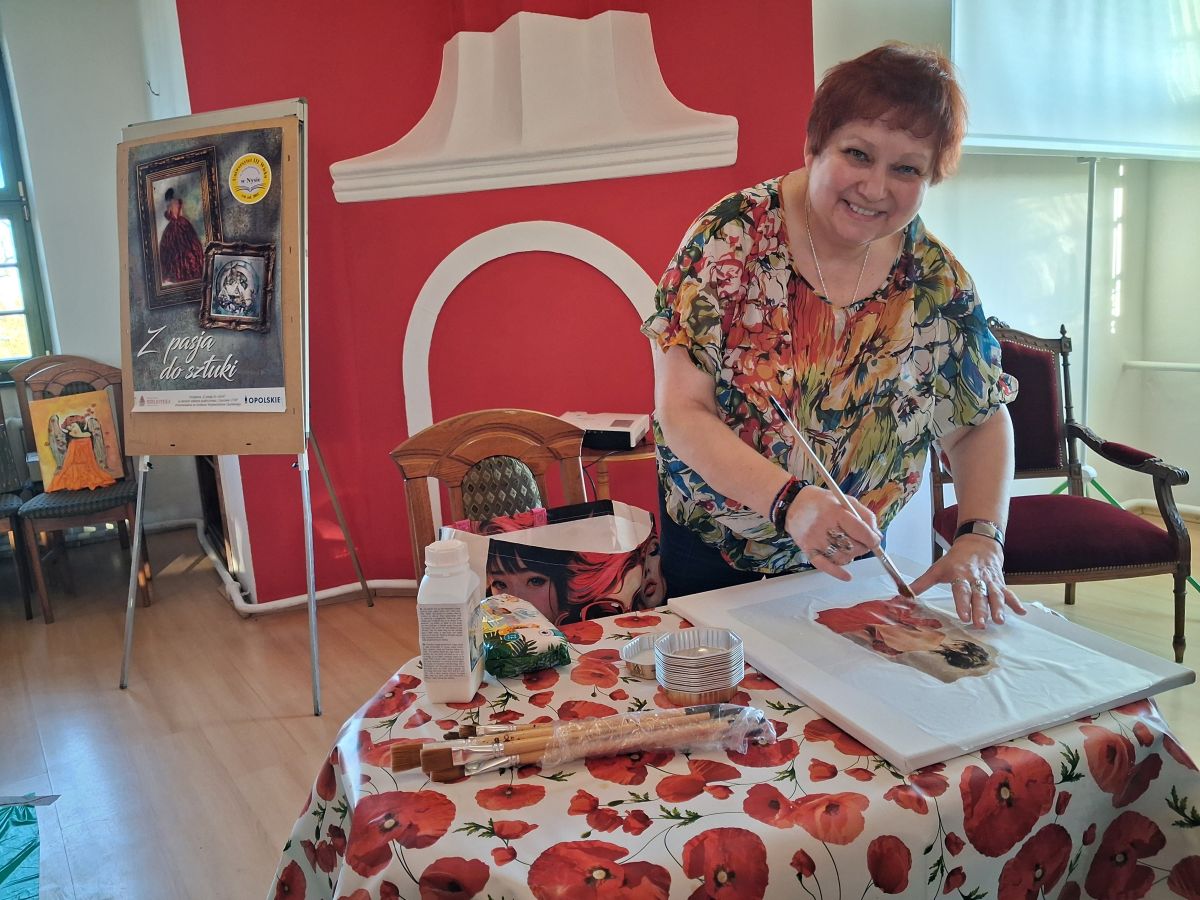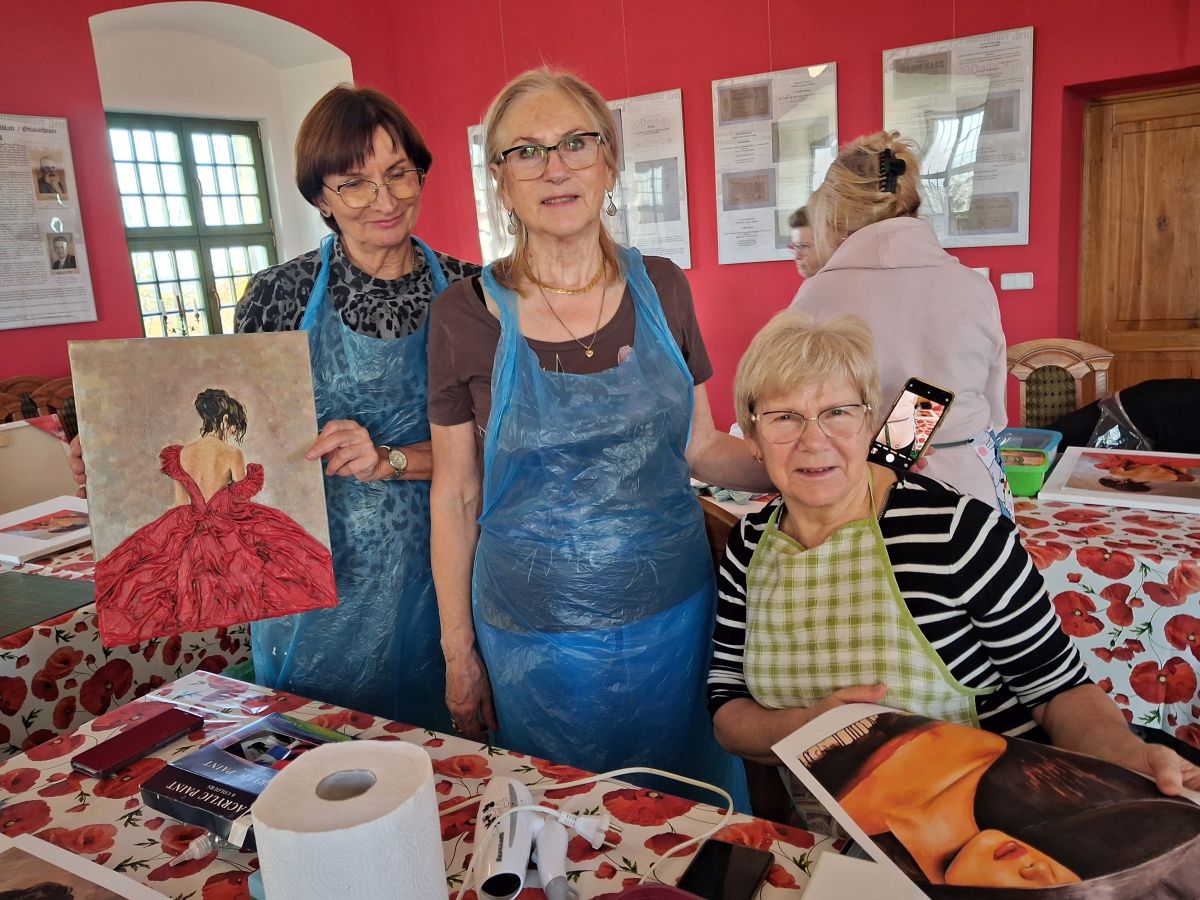 Ewa Morel - koordynator projektu, prowadząca wspólnie z p. Janiną Chadryś Klub Rękodzieła „Nie tylko z igłą” działający w UTW Nysa od 2012 roku, przedstawiła p. Jadwigę Krawczyk, pozdrowiła nieobecną p. Katarzynę Romanowską, życząc szybkiego powrotu do zdrowia - znane nyskie artystki, które od lat prowadzą działający w UTW Klub Malarski.