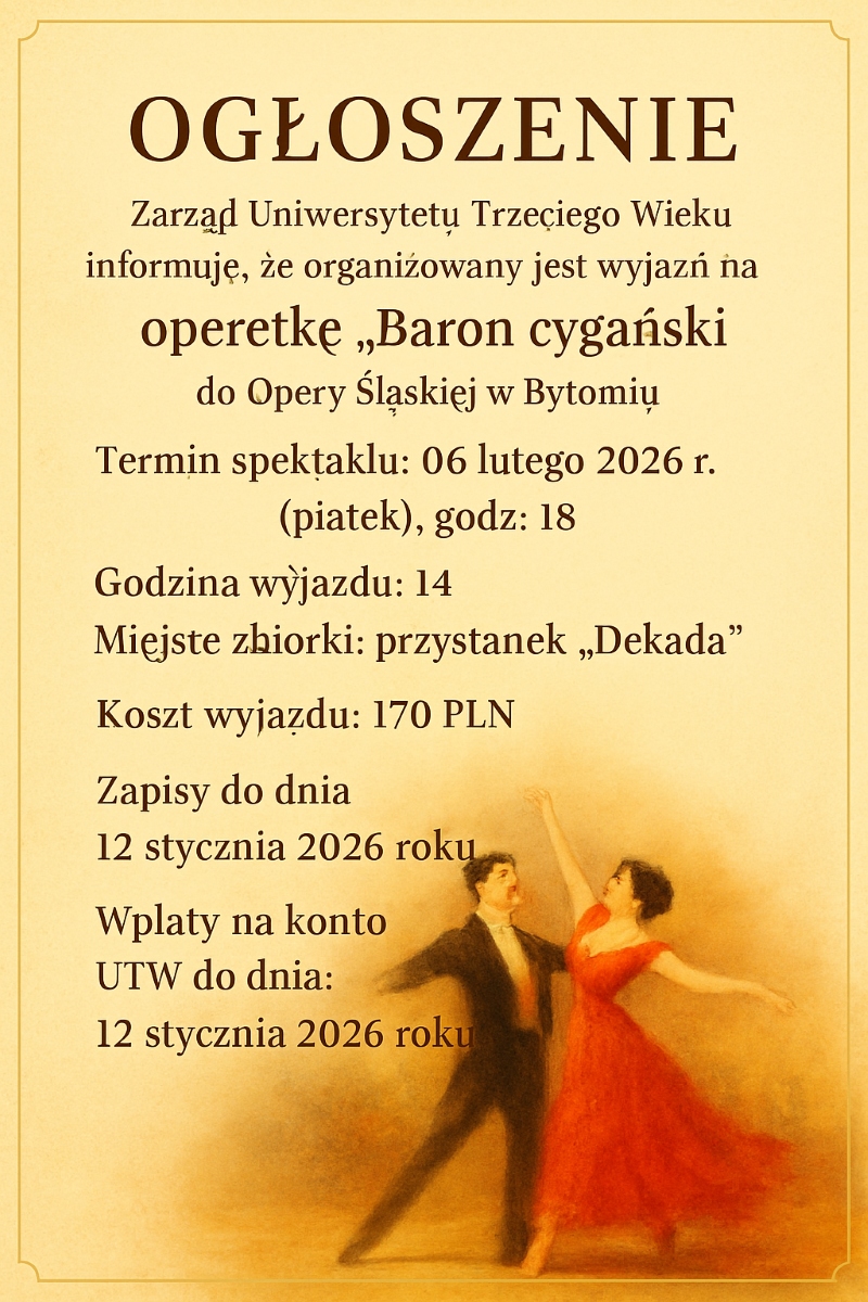 Zarząd Uniwersytetu Trzeciego Wieku informuje, że organizowany jest wyjazd na operetkę „Baron cygański” do Opery Śląskiej w Bytomiu.